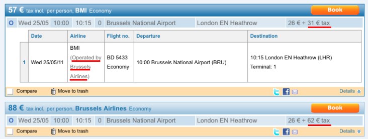 My inbound flight was booked, still had to figure out a way to get to London.  A one way train ticket would be €56, a one way flight €57 (BMI).  Easy choice.  Once again Bravofly.com demonstrated it’s power.  It not only combines regular and low-cost airlines, it also makes combinations of oneway tickets to find the cheapest fare.  Using this kind of ticket search engines, you might noticed intriguing pricing policies.  Example: That €57 one way BMI flight is in fact operated by Brussels Airlines.  Brussels Airlines sells the same flight for €88.  The base fare is €26 for both airlines, but there’s a €31 difference in taxes.  The reason behind this is the difference in fuel surcharges: a €36 fuel fee at Brussels Airlines versus a €5 fuel fee at BMI.  Both airlines have an additional fee for credit card payments: €6 at BMI and €7.5 at Brussels Airlines.  As BMI is a Star Alliance partner, I should be able to collect some miles on this flight too. (we’ll see about that)Picture: Bravofly.com screenshot shows Brussels Airlines flight sold cheaper by BMI