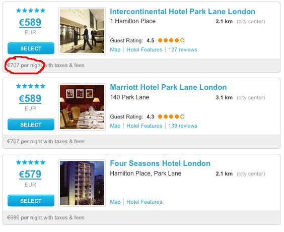 Hotels in London are incredibly expensive.  The timing of my trip made it even worst.  UEFA Champions League final 2011 at Wembley stadium on May 28. All luxury hotels fully booked or showing astronomical room rates, also on the days before the final.  Have a look at this HotelsCombined.com screenshot: