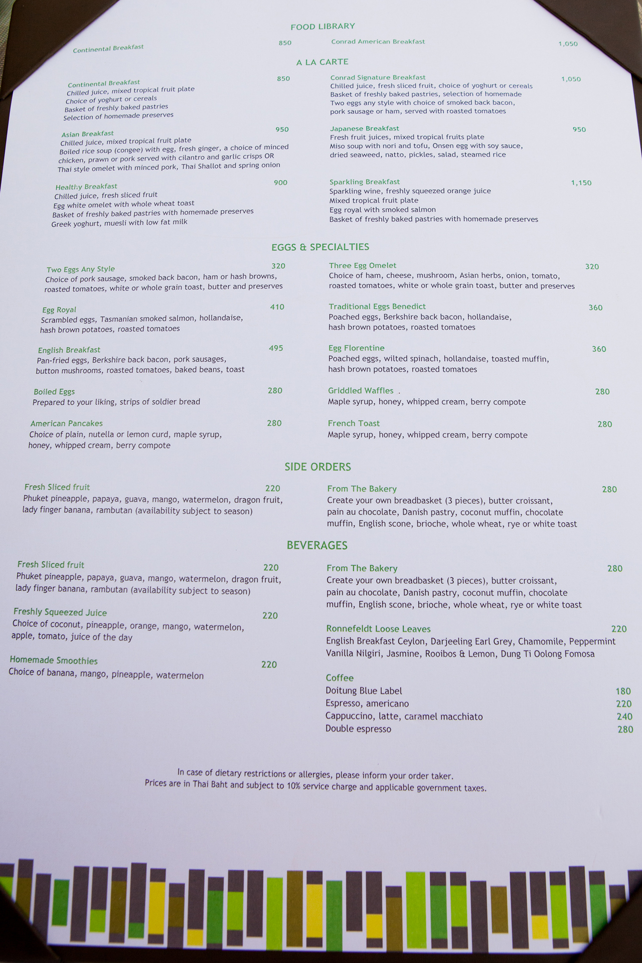 The downside of exclusive resorts like Conrad Koh Samui is their remote location. Without own transportation means, it’s quite hard to leave the resort and the nearest restaurants and shops are not at walking distance. This works in the advantage of the resorts who tend to charge much higher prices for food and drinks compared to the local market value. Fortunately, my free Hilton HHonors Gold status comes with complimentary breakfast for up to two room guests. This allowed us to take an extensive daily ‘brunch’ covering both breakfast and lunch. As HHonors Gold, we could order anything from the menu (except the Sparkling Breakfast option) and/or we could serve ourselves at the buffet.