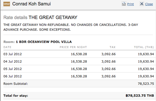 Back to the subject of this post, Conrad Koh Samui in Thailand. A property with 66 villa’s located on a west facing hill in the Southern tip of the Koh Samui island. Opened in September 2011, with an average room rate well above THB20,000 (€500) per night, not particularly fitting the average travel budget. Except if you collected and/or bought Hilton HHonors points. The hotel is ranked Category 7 in the HHonors program, meaning 50K points are required for a free night. HHonors Elite Members (Silver, Gold and Diamond) get discounts on the number of points required for extended stays. As I obtained HHonors Gold status for free last year, I was eligible for a 15% points discount on a four night stay: 42500 points per night (4 nights = 170K) instead of 50,000 (4 nights = 200K). Before my 150K points purchase, I had 16,565 HHonors points in my account. The missing 3435 points to total the 170K were offered during the booking process for $34,35 (€28). That brought the total for 4 nights at Conrad Koh Samui to €661,46 (€633,46 (150K) + €28 (3K) +16K points which were in my account) A paid stay at my one bedroom Oceanview Pool Villa using the cheapest non-refundable rate would have cost me THB78,523 (€2020)!