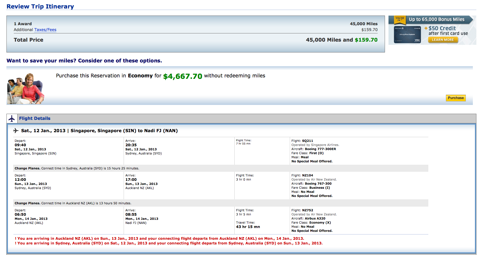 Back in July 2012, Singapore Airlines made a mistake while upgrading their booking engine.  They took it offline for a weekend long upgrade, but when their systems came back online, for a brief moment (24h), it was possible to book Singapore Airlines Business and First Class awards via frequent flyer programs of Star Alliance partners.  This was unintentional, as they normally release longhaul C and F award space exclusively to their own loyalty program, KrisFlyer.  I used this opportunity to book Singapore-Sydney-Auckland-Nadi for 45K United miles + $159,70 (€132) Taxes/Fees with SIN-SYD in Singapore Airlines First Class, SYD-AKL in Air New Zealand Business Class and AKL-NAN in Air New Zealand The Works Economy Class.  This routing is also a great sweet spot on the United MileagePlus Award Chart: A First Class award ticket from Singapore to Sydney or Auckland normally requires 60K United miles, however routing via Australia and/or New Zealand to anywhere in Oceania is only 45K miles!