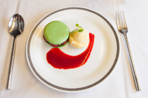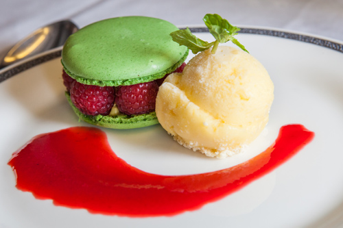 Pic: Macaroon with Pistachio Cream, Fresh Raspberries & Passionfruit sorbet