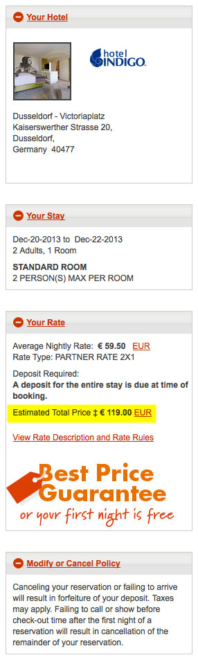Need some more nights to complete your IHG Rewards Club – The Big Win challenge?  Join us on December 20-22 at the brand new Hotel Indigo Dusseldorf – Victoriaplatz (Germany) for a cosy weekend at the Christmas Market!  The IHG 2-for-1 rate (make sure to select ‘Partner Rate 2X1’ as Rate Preference) at Hotel Indigo Dusseldorf is currently at its low: €119 for two nights!  See you in Dusseldorf?  PS. Leave a comment if you’re interested in carpooling from Brussels.  Thanks!