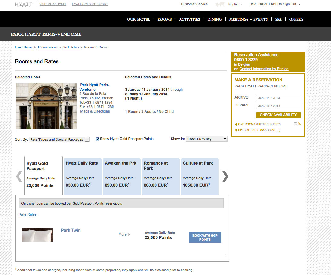 For my one-night stay in Paris, I used Hyatt Gold Passport points to book superstar hotel Park Hyatt Paris Vendôme. It was the last opportunity to book this hotel at 22,000 points before Hyatt’s introduction of the Free Night Award Category 7 which requires 30,000 points per night. The best available rate for my stay was €830 ($1127) The 22K points required for my free night at Park Hyatt Paris-Vendome were earned during my Hyatt Gold Passport Diamond Status Match Challenge back in 2011.
