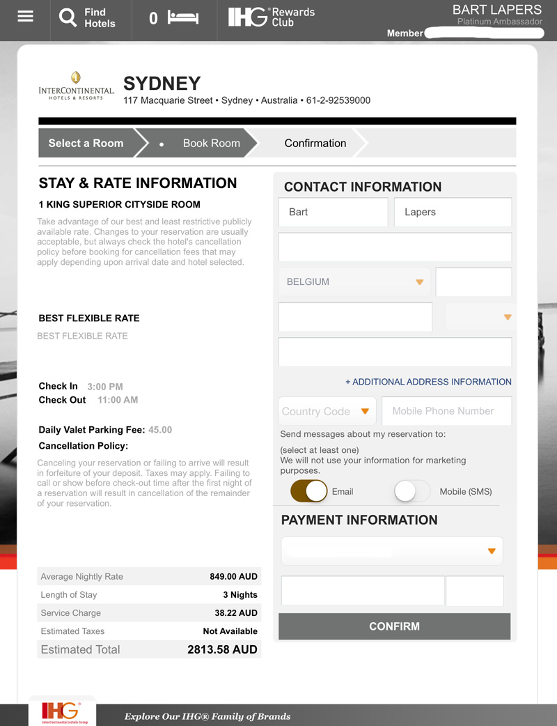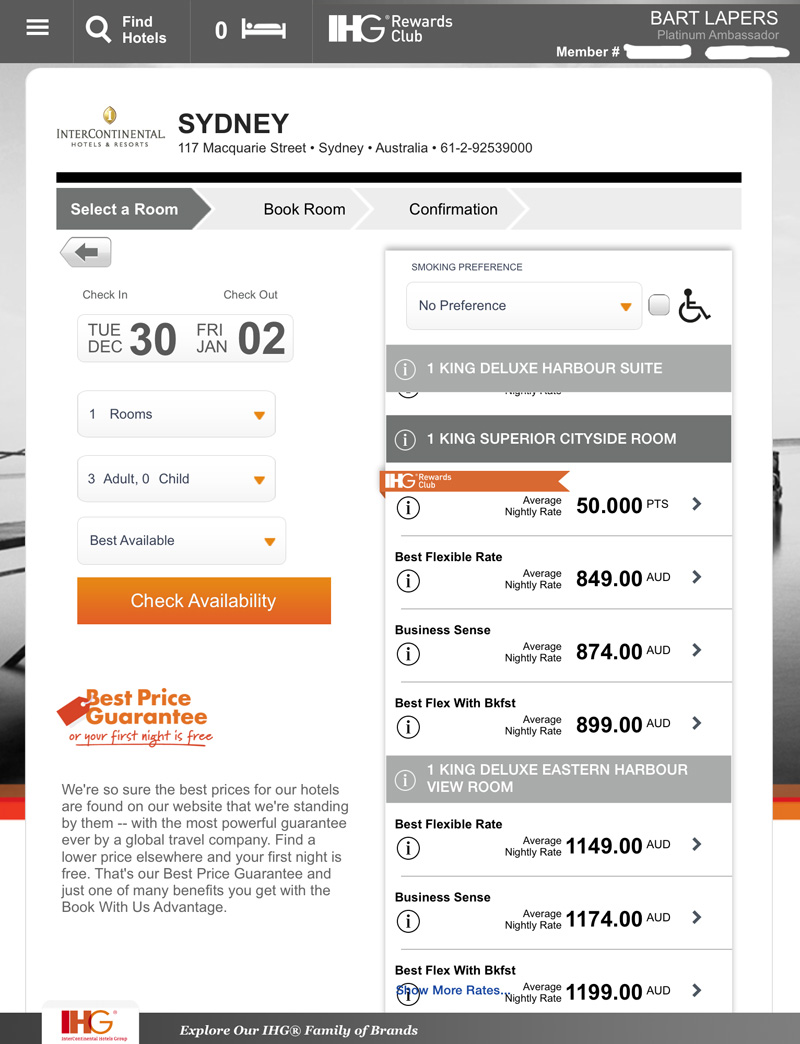 After celebrating New Year’s Eve on Times Square in New York and at the Big Ben in London, Sydney was next. I flew Qantas First Class from London to Melbourne via Dubai and connected to Sydney in Qantas Business Class. (more on that later) As you might imagine, hotels were really expensive for NYE. Instead of paying 2813AUD (~€1986), I used 150K IHG Rewards Club points to book a Superior Cityside room for 3 nights at InterContinental Sydney. Another great points redemption! 😉
