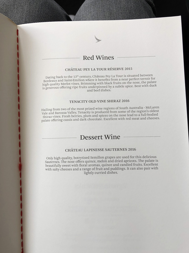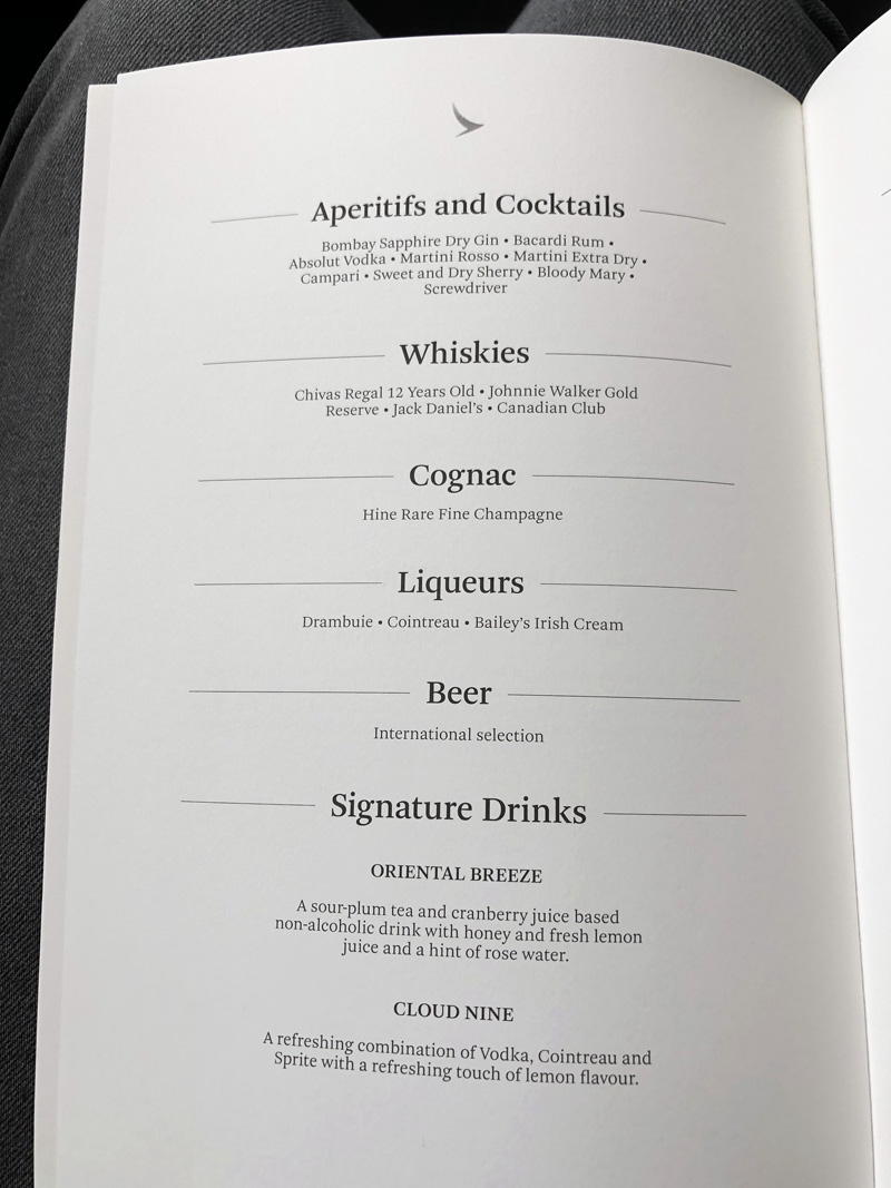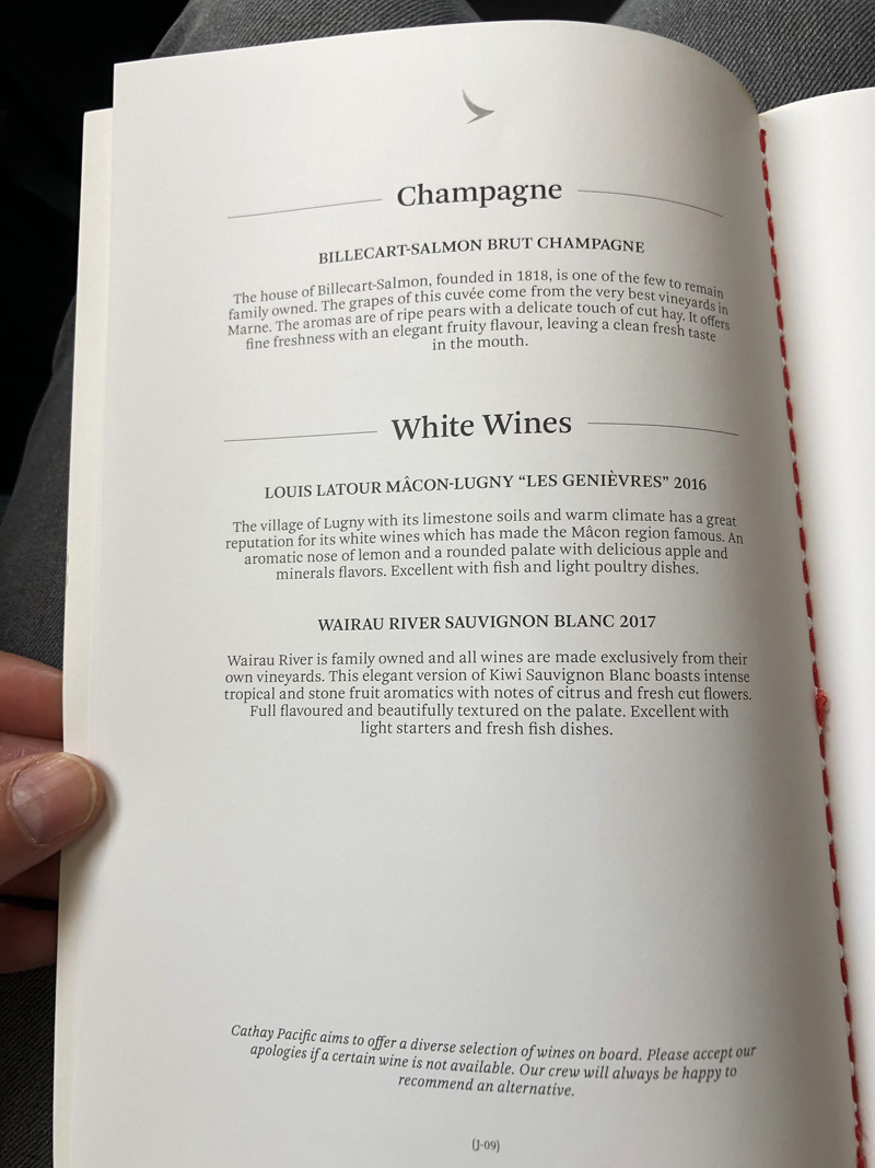After take-off, I ordered a glass of Billecart Salmon champagne which was served in combination with warm nuts. I was handed the menu which read as follows: Cover, Intro Culinary Team, Lunch, Snacks & Breakfast, Drink List, Champagne and White Wines, Red Wines and Dessert Wine, Aperitifs and Cocktails.