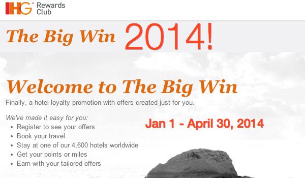 Excellent news! IHG Rewards Club just announced the’ll continue The Big Win offer in 2014. As of Monday December 16, 2013 you can register for the first 2014 Big Win (for stays January 1, 2014 – April 30, 2014) Looks like we’re going to mattress run even more next year! 🙂