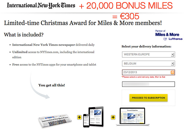Lufthansa Miles and More currently has a 20,000 bonus miles offer for new International New York Times subscriptions (6 months). Total cost is €305, which comes down to buying miles at €0,015 each. This is much cheaper than buying miles directly from Miles & More. Even with the current 20% bonus, you’re still paying €0,02 per mile and you’re limited to buying 12,000 miles per calendar year. This is a good opportunity if you need to top-off your account for an award reservation. Offer is valid until 25 December, 2013.
